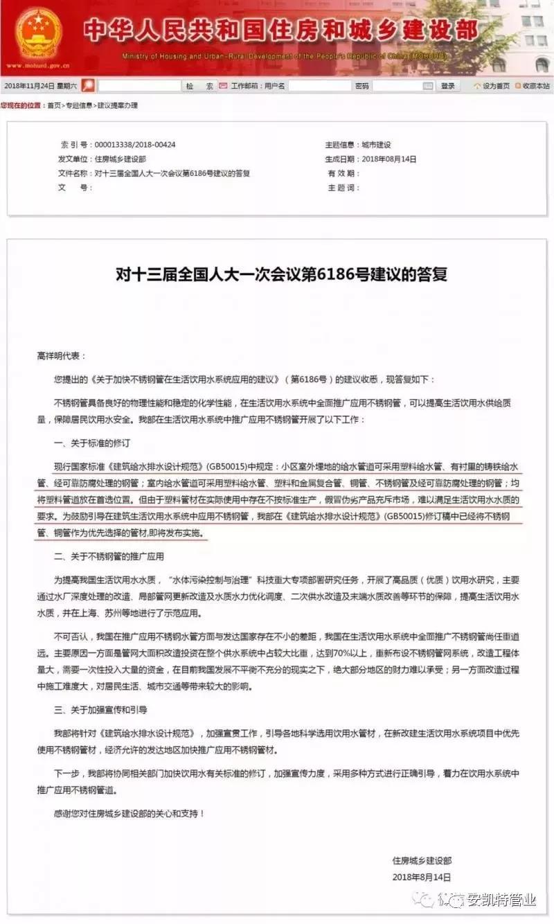 住房城鄉建設部再次明確:建筑生活飲用水系統優先選擇不銹鋼水管!