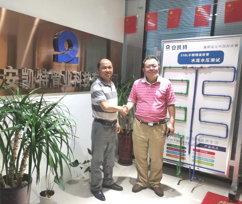 5月8日,佛山市金屬材料行業協會執行會長李強(兼任四川省川聯不銹鋼產業商會執行會長)和四川省川聯不銹鋼產業商會專職副秘書長羅紀豪蒞臨安凱特,在安凱特董事長鄭虎先生的陪同下,交流不銹鋼水管的市場機遇與商機。